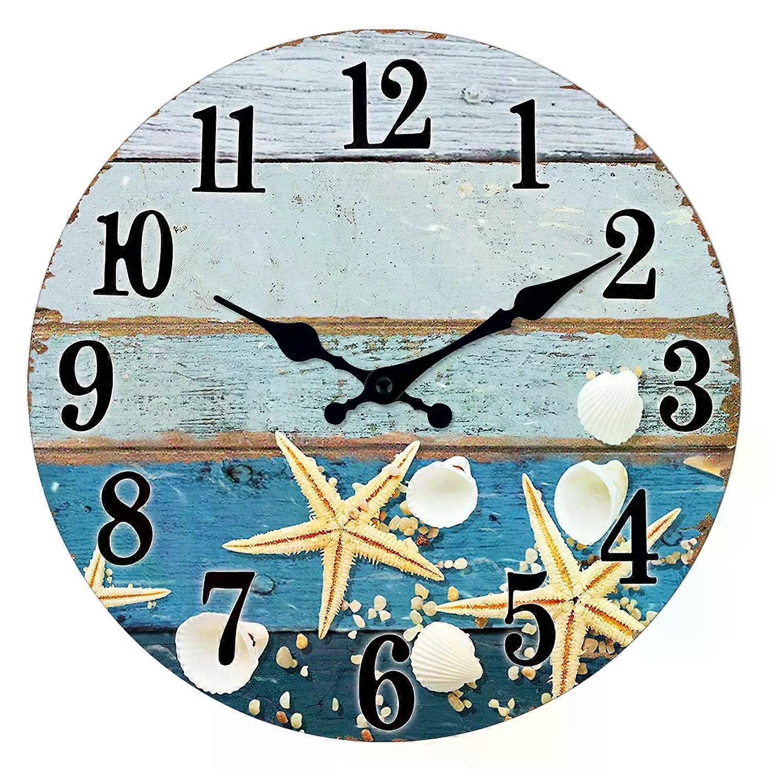 Retro Starfish Shell Wooden Board Texture Pattern Wooden Wall Clock Living Room Bedroom Kitchen Home Decoration Wall Clock Silent Quartz Clock Holiday