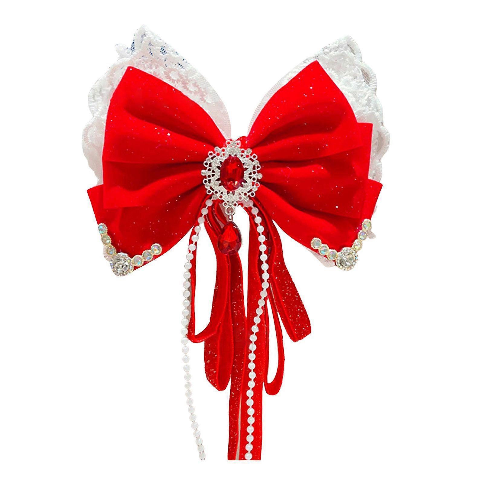 Mengxi Chinese New Year Hairpin with Lace Rhinestones Bow Style Hair Pin with Tassels Design Festive Hair Accessory
