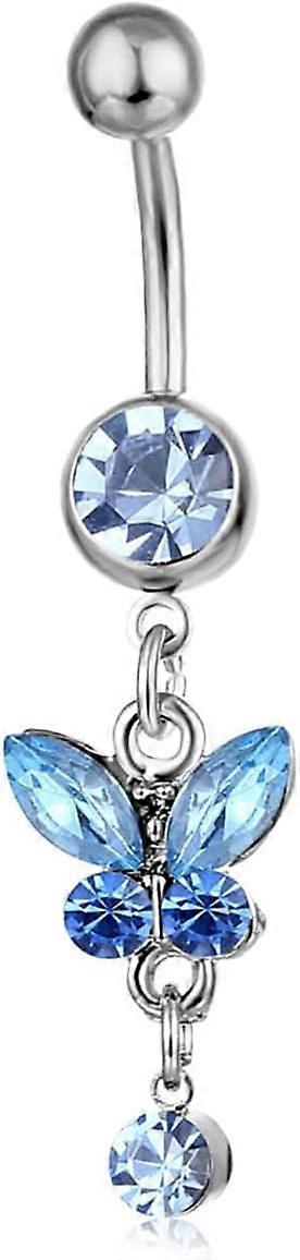 Rhinestone butterfly belly button ring, medical stainless steel diamond pendant, crystal belly button stud, butterfly jewelry, women's light blue.