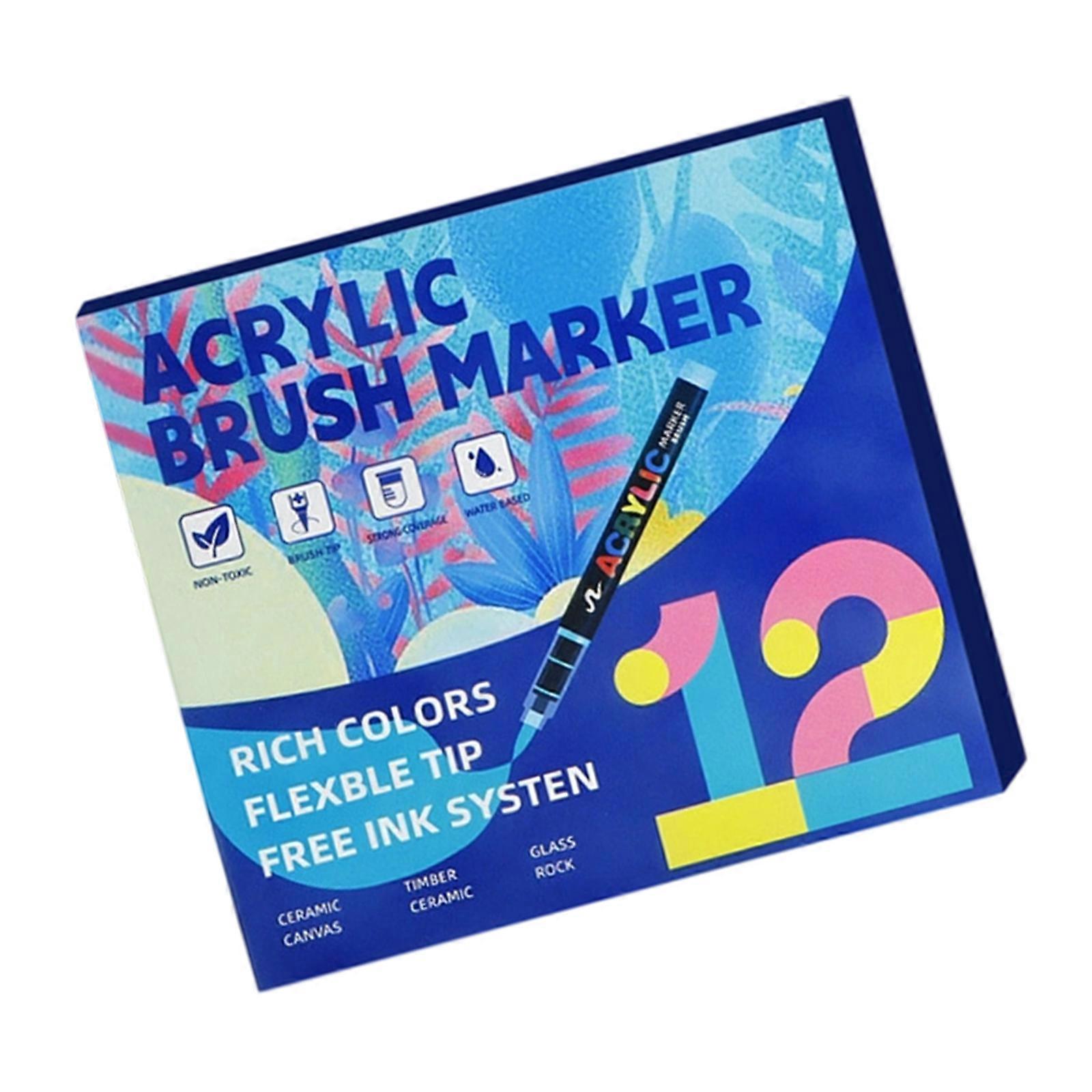 12 Color Liquid Acrylic Marker Brush Tip Acrylic Paint Pen for Journaling Drawing on Paper Stone Rock Canvas Wood Glass 12color blue box