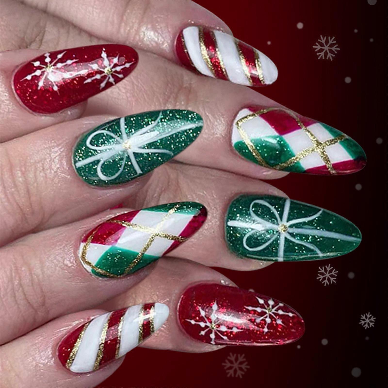 24Pcs Holiday Glitters Artificial Nail Green Plaids Christmas Design ABS Materials Party Fake Nail Durability ABS Build Multicolor
