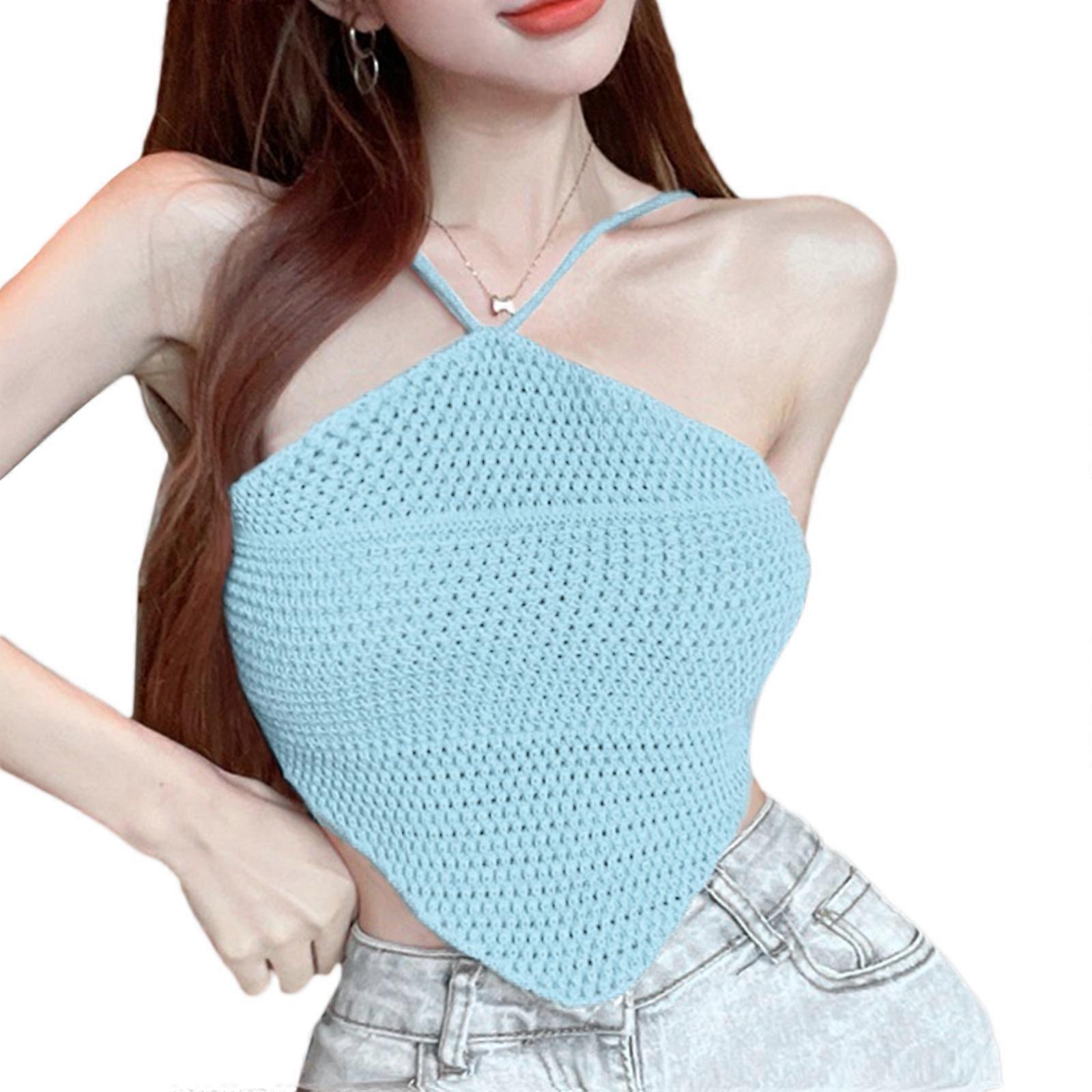Sleeveless Halter Solid Short Shirt Hangings Suspenders Ribbed Crop Tube Tops Y2K Backless Parties Clubs Tanks Vest Sky Blue One size fits all
