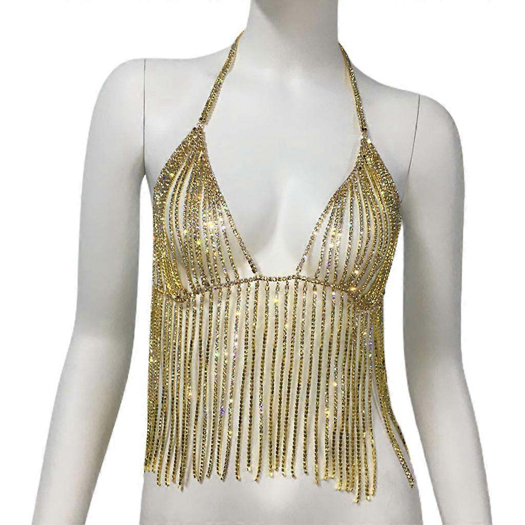 Women's Fashion Sexy Rhinestones Bra Crystal Bikini Body Chains Jewelry Tassel Crop Top for Nightclub Party Gold