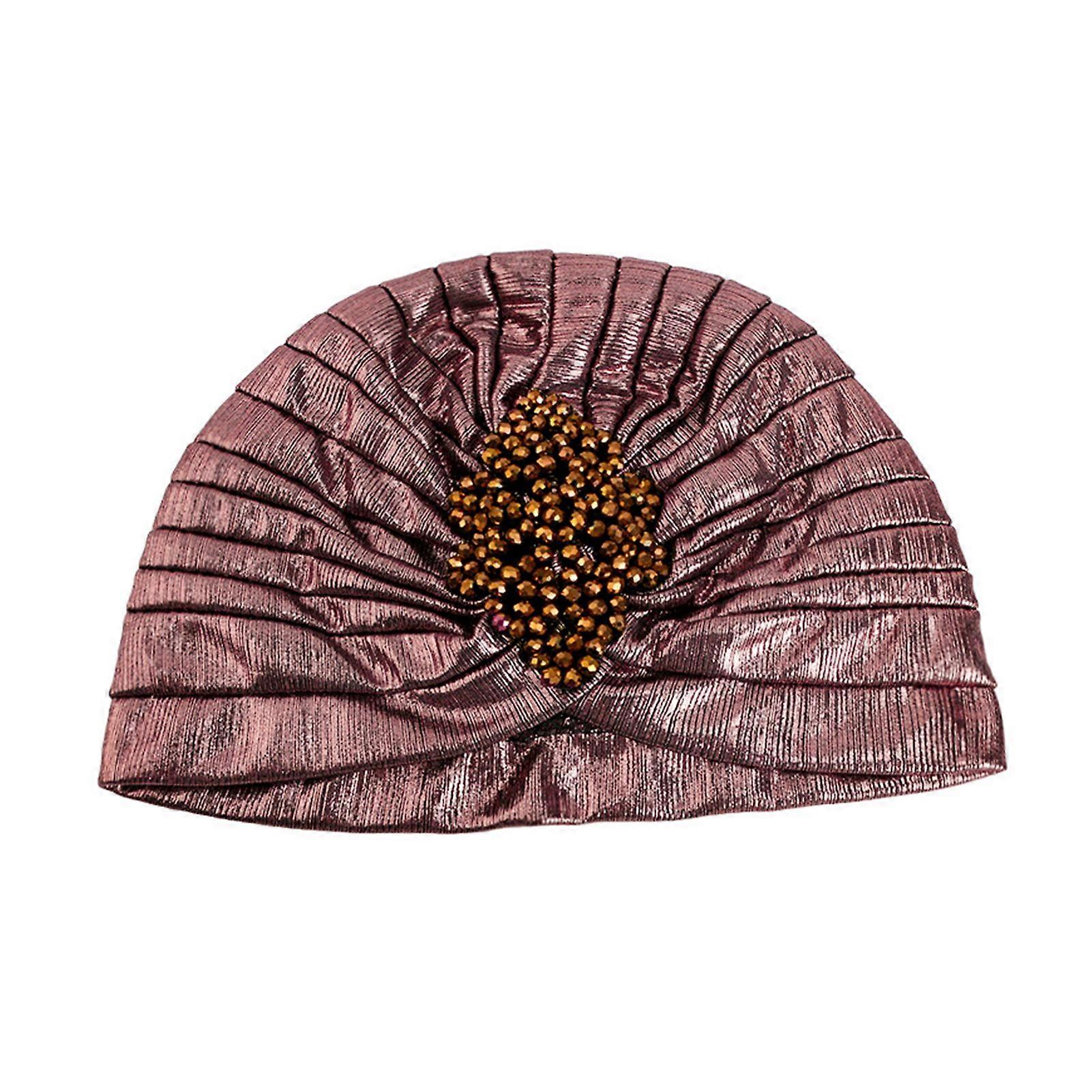 Mengxi Women Top Hat Rhombus Rhinestones Decor Pleated Turban Hat Golden Plated Embellished Hat Elastic Design Headwear