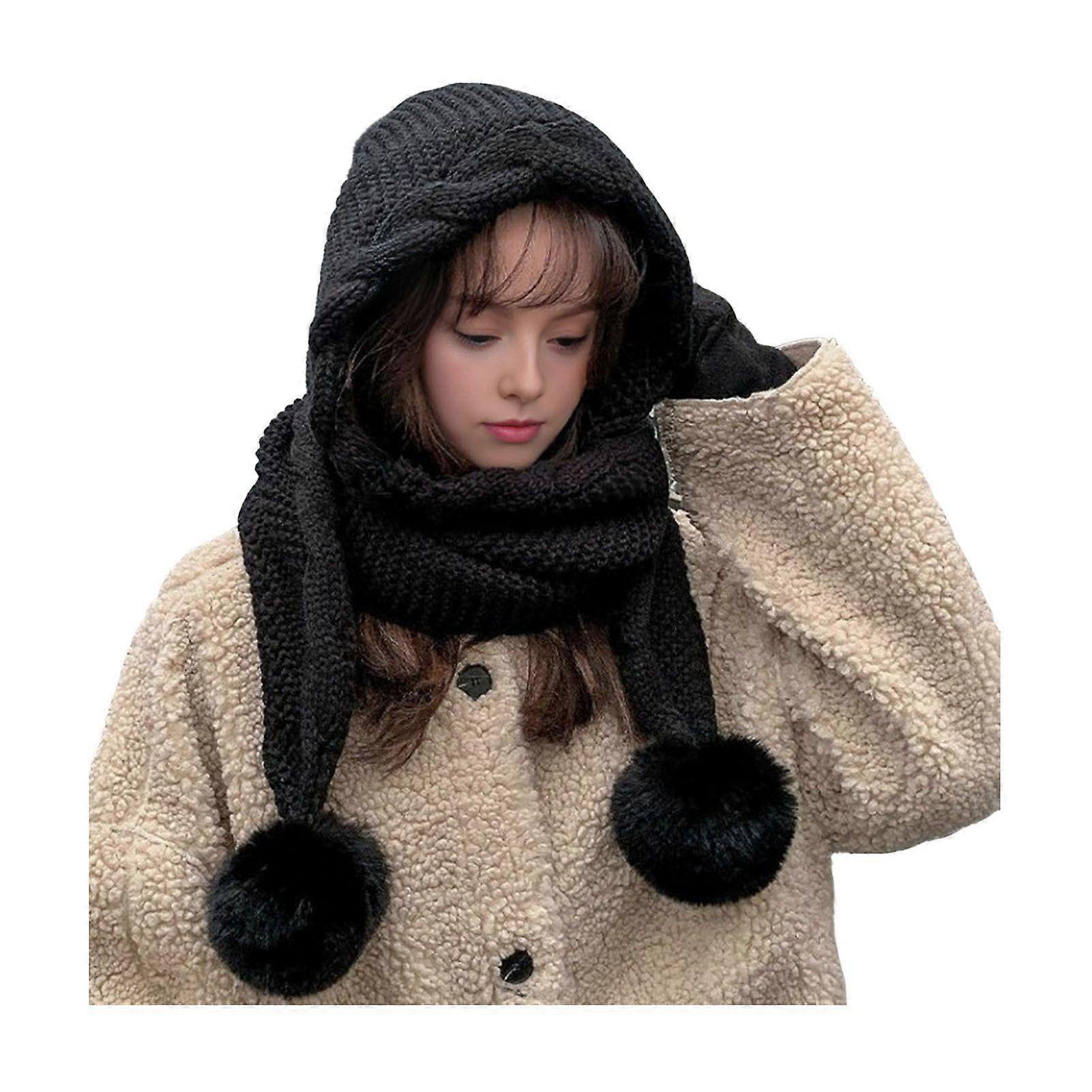 Mengxi 2 in 1 Hat And Scarf Set Winter Knitted Hooded Scarf Soft Warm Crochet Hat Scarf Set with Faux Fur Pompom Ball for Cold Weather