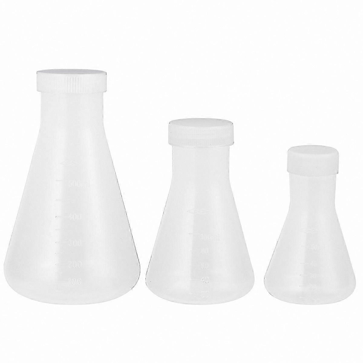 3-Piece Plastic Conical Flask Set with Screw Caps for Lab Experiments (50ml, 100ml, 500ml) White