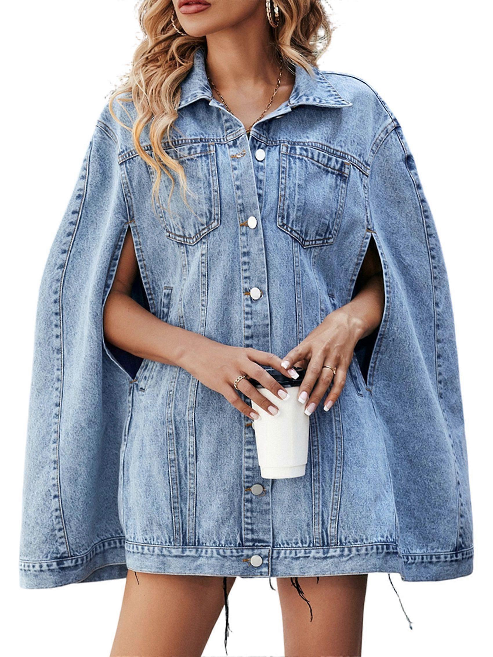 Denim Jacket for Women Poncho Cape Style Jean Jackets Loose Outerwear Blue L