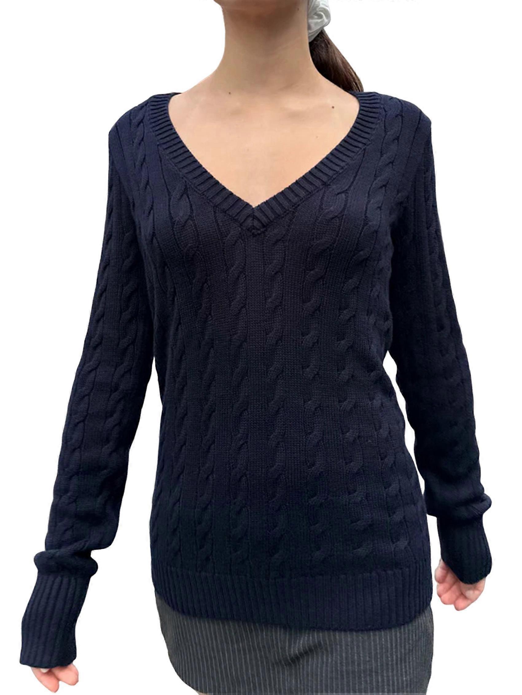 Women'S Long Sleeve Cable Knit Sweater Fall Fashion V Neck Fitted Pullover Casual Work Fall Outfits Navy Blue XL