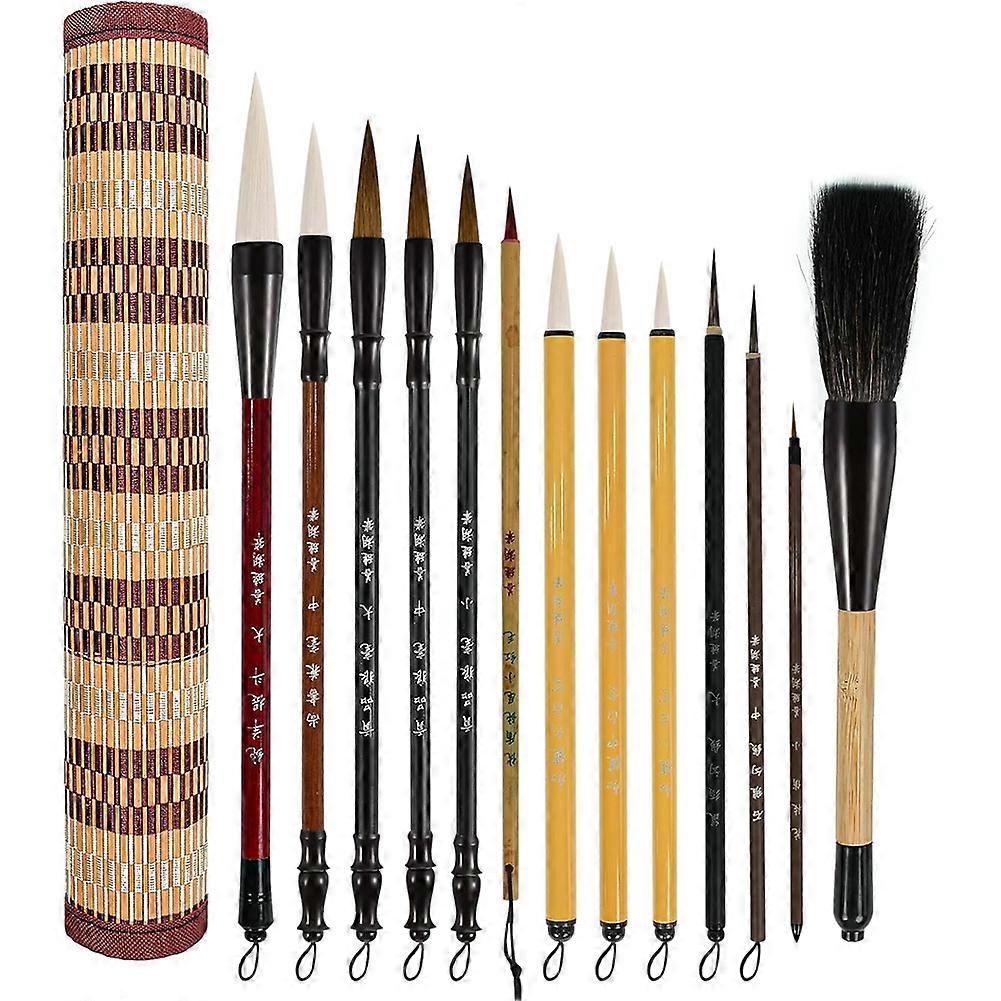 13PCS Chinese Calligraphy Brush Set, Writing Brush Bamboo Storage Scoll, Chinese Kanji Sumi-E Drawing Watercolor Brush