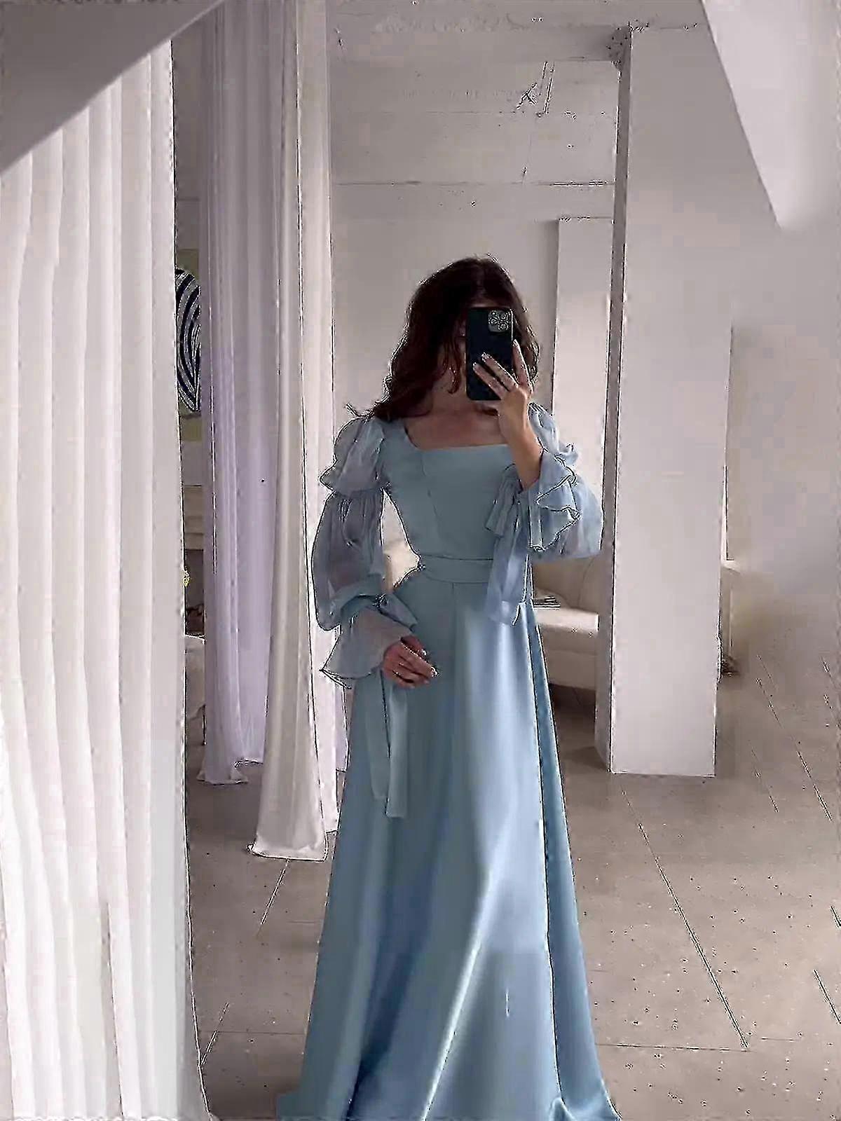 f Elegant Lady Street Wear Women Chiffon Satin Evening Dress Solid Color Square Collar Belt Flare Sleeve Pleated Female Dresses