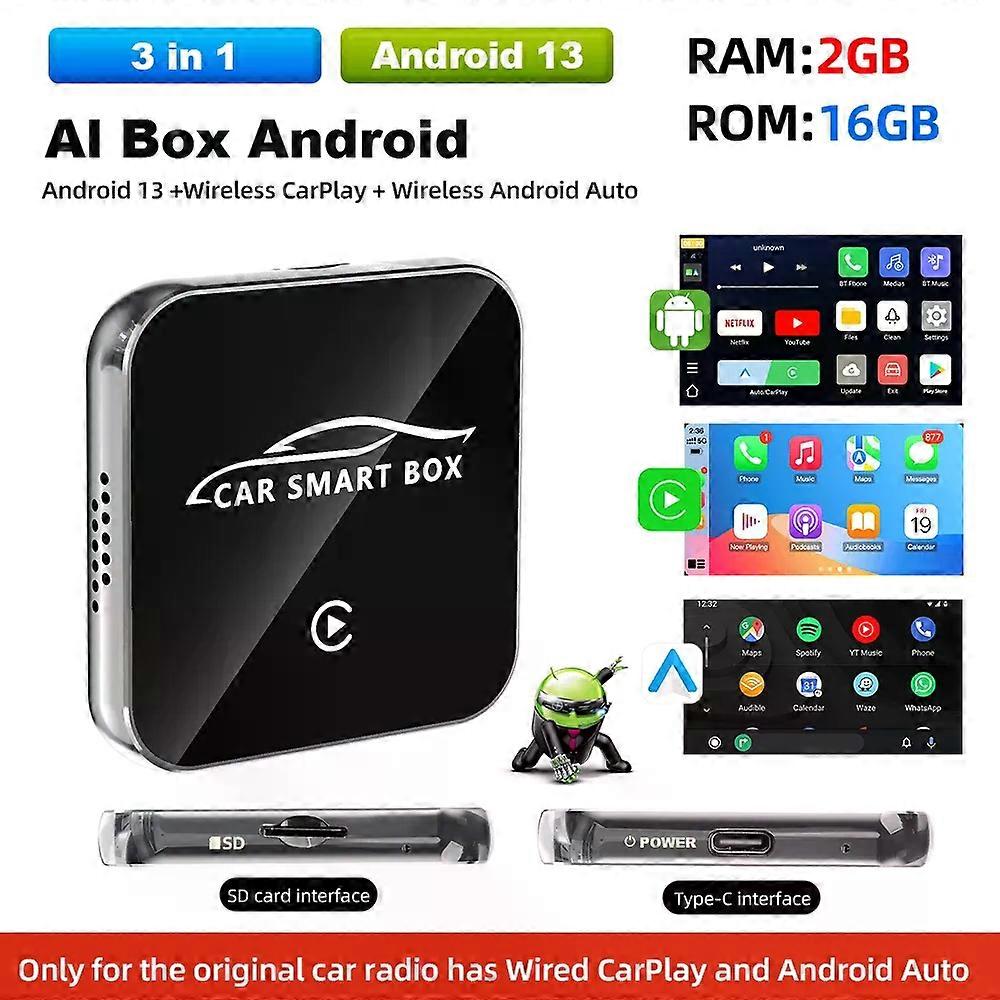 Specifications High-concerned chemical:None Origin:Mainland China Brand Name:AKAMATE Name:Smart AI Box Bulit-in play store:Bulit-in Netflix Youtube Wired to Wireless CarPlay:Support Wired to Wireless Android Auto:Support RAM:2G/4G ROM:16G/64G Android System:Android13.0 Item Description Note This Android box only fits for original car radio with wired CarPlay function, before ordering, please make sure your original car radio has wired CarPlay function. Equip with RAM 2G/4G ,ROM16G /64G. 3 in1 Wireless Al Box Note:Only for the original car radio has Wired CarPlay and Android Auto. Multifunction Box Multiple Scenes Can Be switched At will. Wired to Wireless CarPlay Android Auto Support Popular Video Player &SD Card Please do not watch videos while driving, drive safely. Main Function The memory configuration provides two flexible options: 2GB of RAM+16GB of ROM, or 4GB of RAM +64GB of ROM. All In Control Keep original Car Control -Preserving Unaltered Performance,Safety.and Driving Pleasure. Dual Reading Modes You can insert an SD card or mobile phone link for media playback. 4-core CPU Supports the use of multiple apps at the same time without lagend the powerful chip is more efficient High Quality & Heat Dissipation Design Wide compatibility Suitable for original cars with wired CarPlay or wired Android Auto How to use our Product 1.First You need connect the BOX to the car head unit USB port. 2.Wait for about ten seconds and automatically enter the Android system .( Equivalent to adding a set of Android 13 system to your original car ) 3.Connect to use wireless CarPlay or wireless Android Auto. Package Size & List