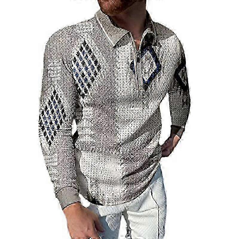 f Polo Shirts Men Long Sleeve Fashion Gray Shiny Rhombus Print New Men's Polo Shirt Long Sleeve Zipper T-shirt Top