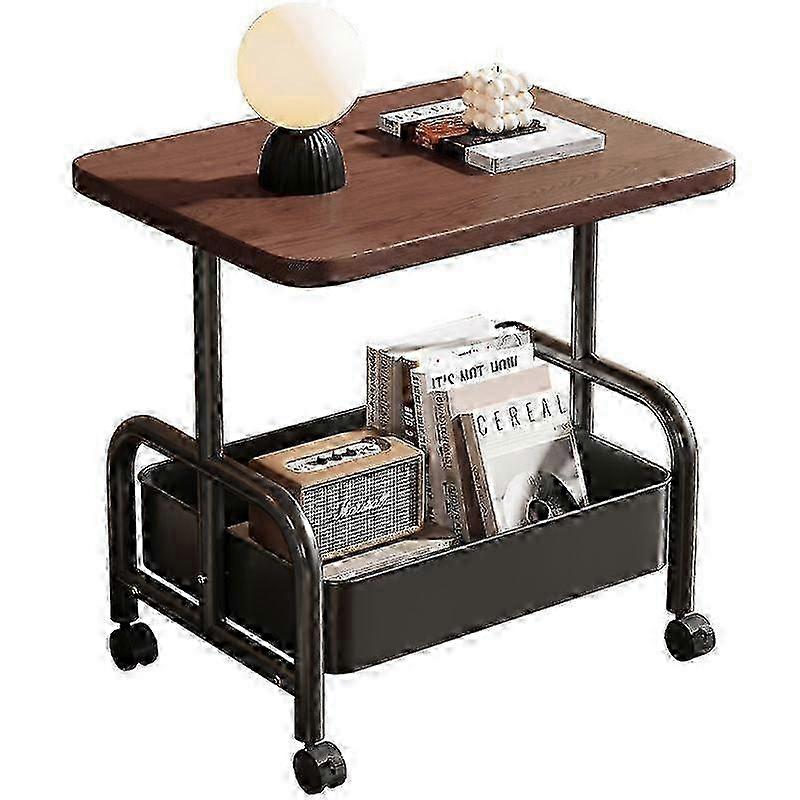 f Rolling Side Table with Storage Shelf, Wood Top & Metal Frame for Living Room