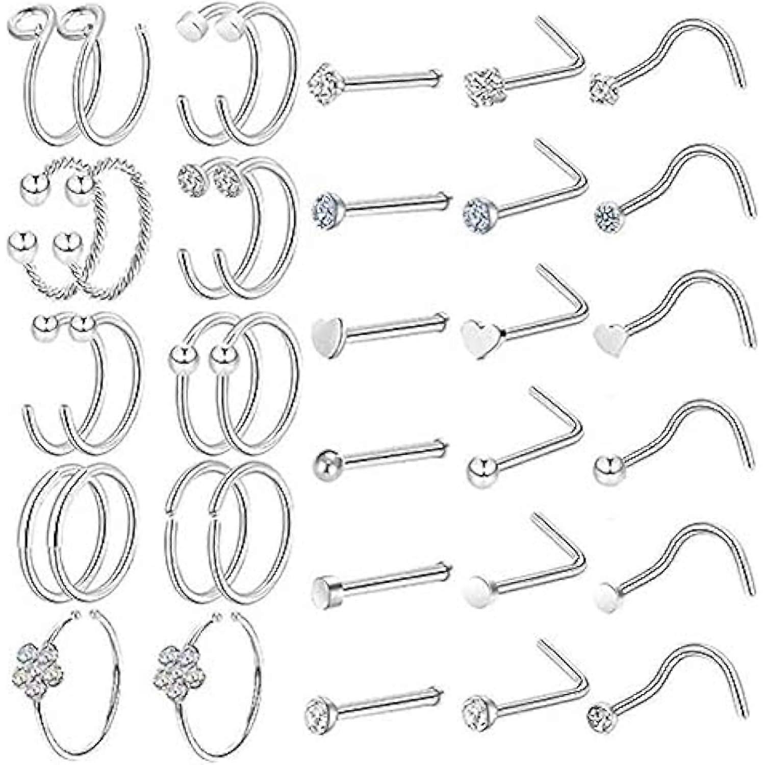 36 L-Shaped Nose Rings, Jewelry for Women and Men, Silver
