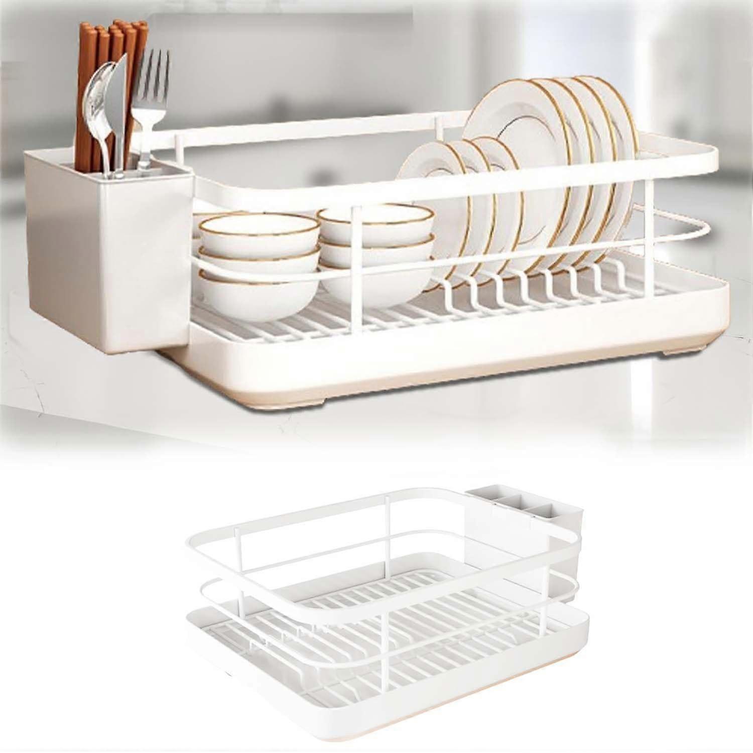 Dish Drying Rack with Cutlery Holder and Drip Tray, Carbon Steel SpaceSaving Kitchen Counter Organizer (White)