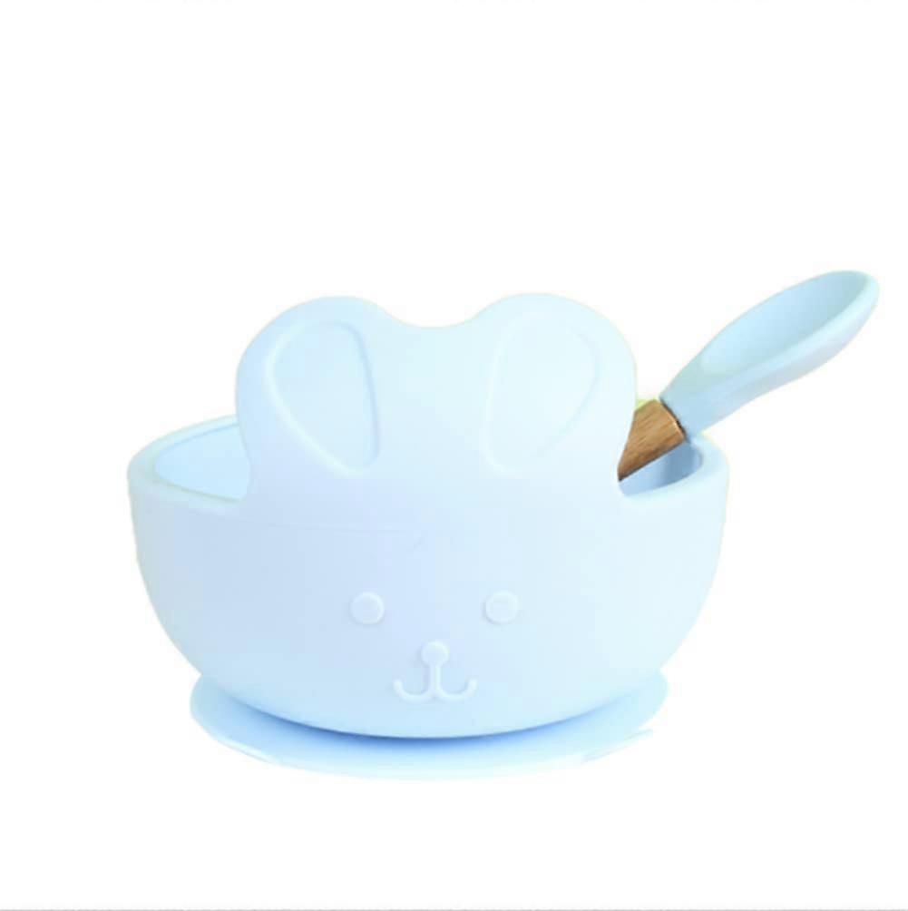 Baby Plate Silicone Bowls With Suction Cup Wooden Spoon Blue FBPA Chair Compatible