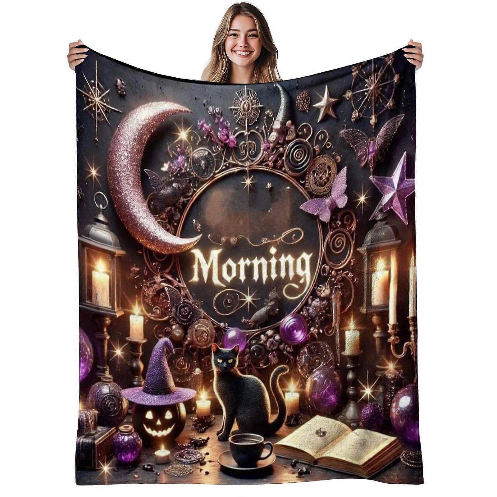 1pc Morning Black Cat Gothic Magic Blanket - Soft Warm Flannel Bedspread Suitable for Bedroom, Living Room, Office - Coz-qacvbg167