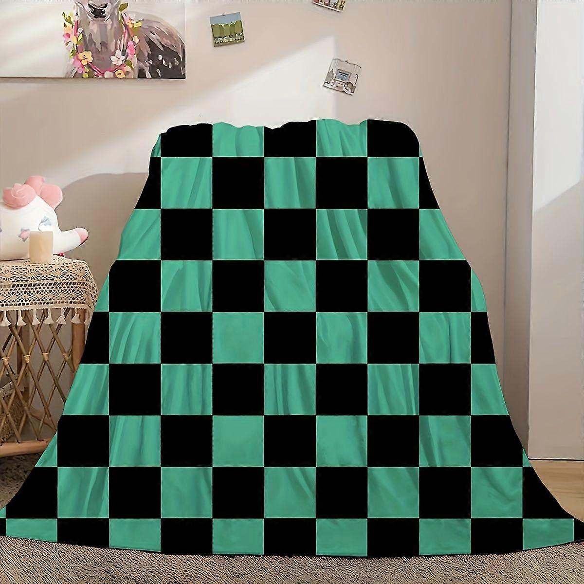 PrintedInUSA Cartoon Anime Plaid Print Flannel Blanket - Soft Warm All-Season Throw, Green Black Checkered Design, Machi-azxcv79