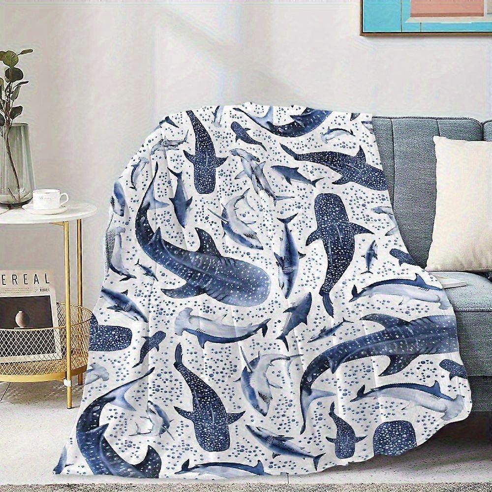 Luxury Soft Flannel Throw Soft Warm Cozy Ocean Shark Flannel Throw Blanket Blue and White Whale Print, 280g/sq.m, Machin-azxcv33