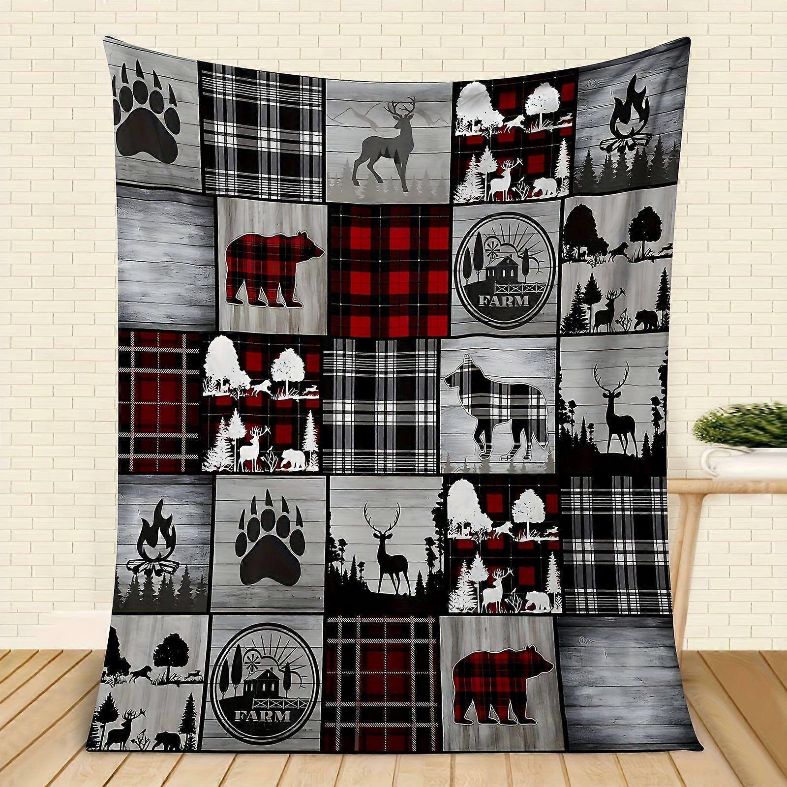 Luxury Heavyweight Flannel Throw Blanket - Bear Paw & Deer Forest Print in Black/Red/Gray/White - Tear-Resistant All-Sea-azxcv158