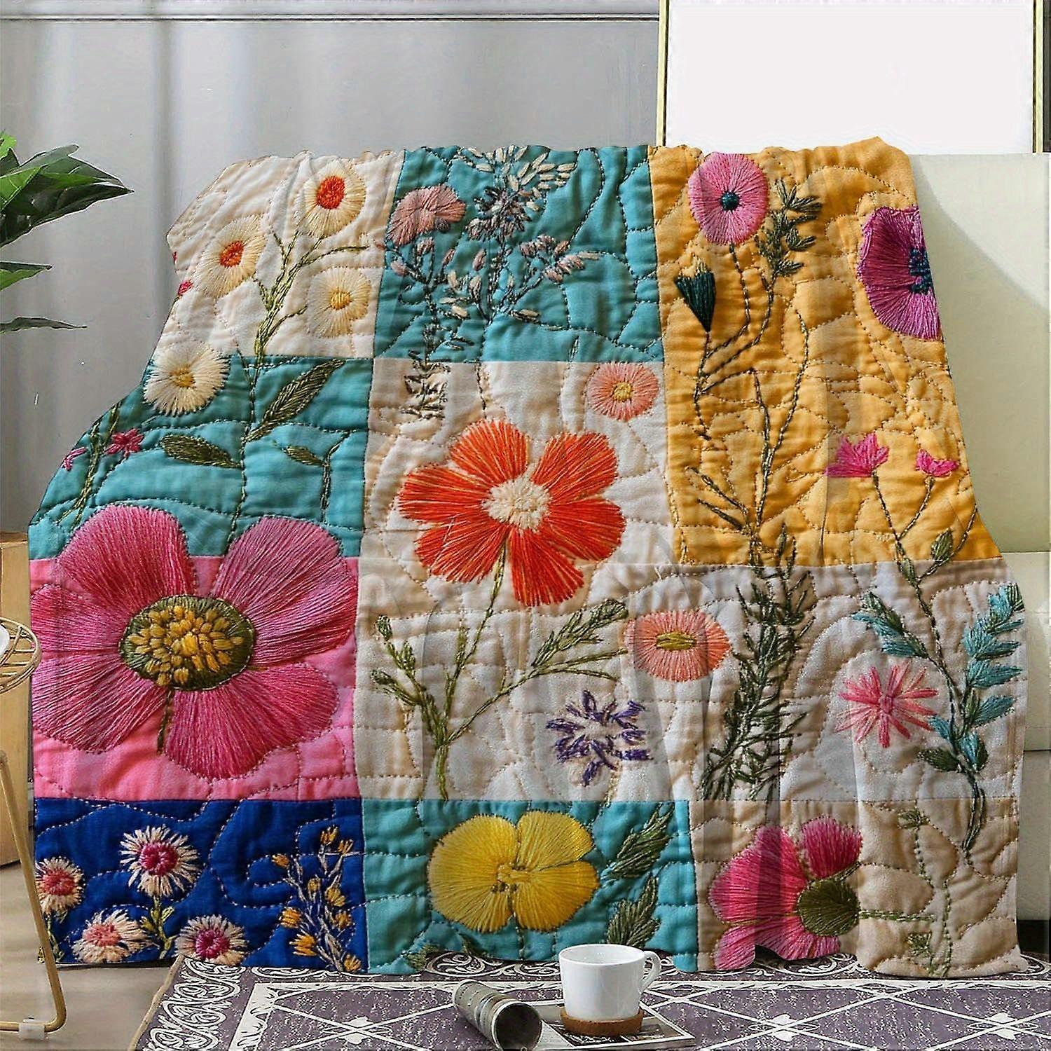 Vintage Floral Patchwork Blanket - Soft Flannel Throw with Multicolor Floral Pattern (Pink/Orange/Blue/Green/Yellow/Purp-azxcv114