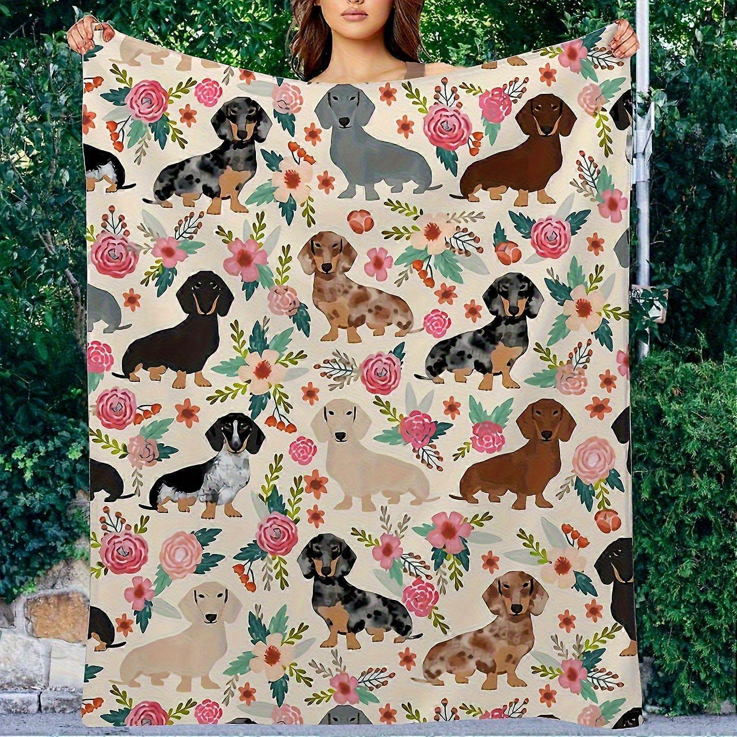 Luxury 280GSM Cottage Style Floral Dachshund Print Flannel Blanket - Soft Warm Anti-Tear Polyester, All-Season Multi-Pur-azxcv89