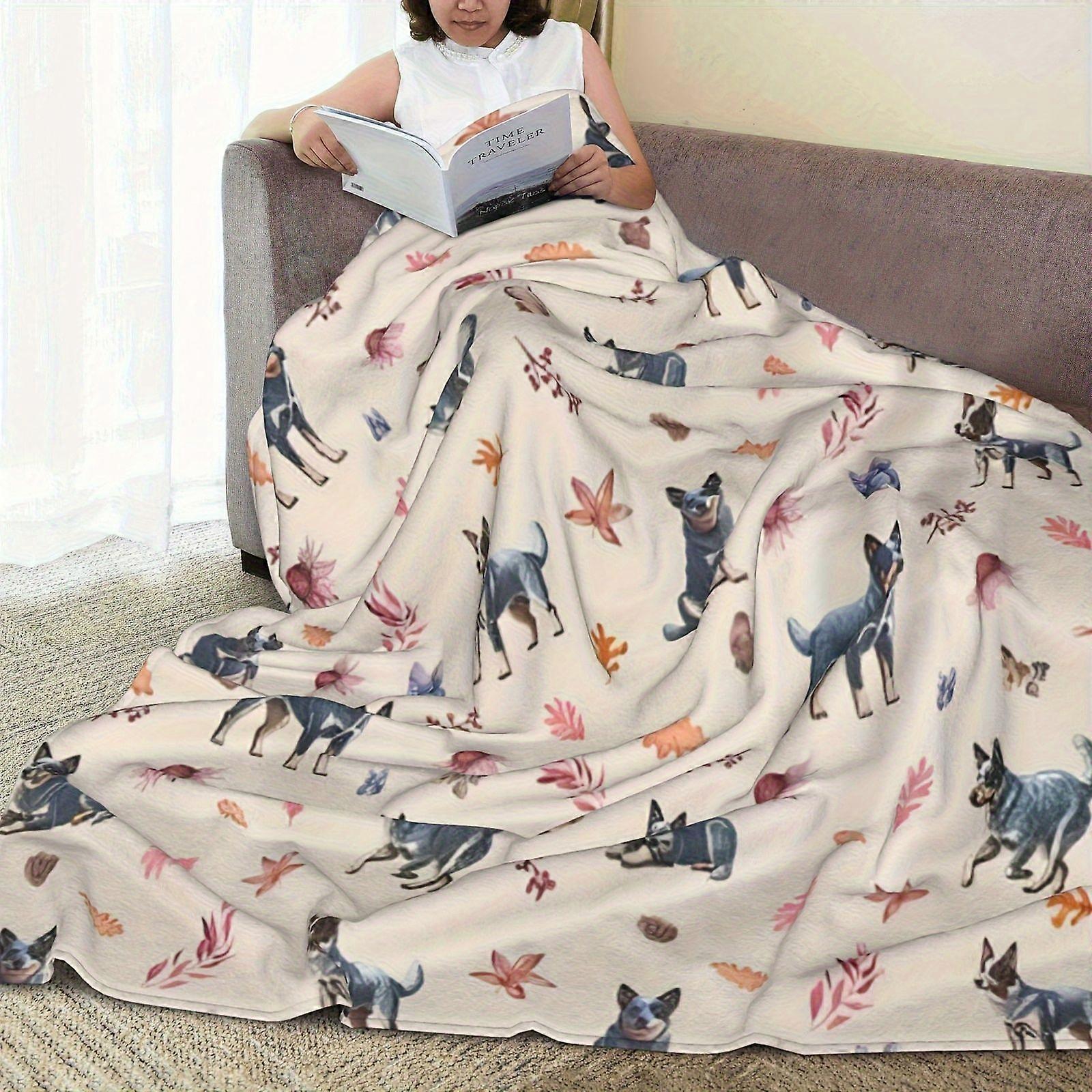 Luxurious Blue Heeler Australian Cattle Dog Flannel Throw Blanket - Soft Polyester, Botanical Autumn Leaves & Wildflower-azxcv216