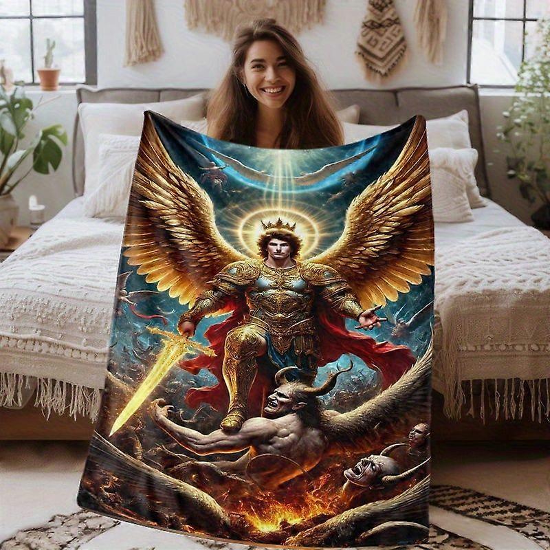 Archangel Michael vs Demons Battle Biblical Design Plush Blanket - Golden & Dark Tones Angelic Sword & Devil Combat Prin-jghds233