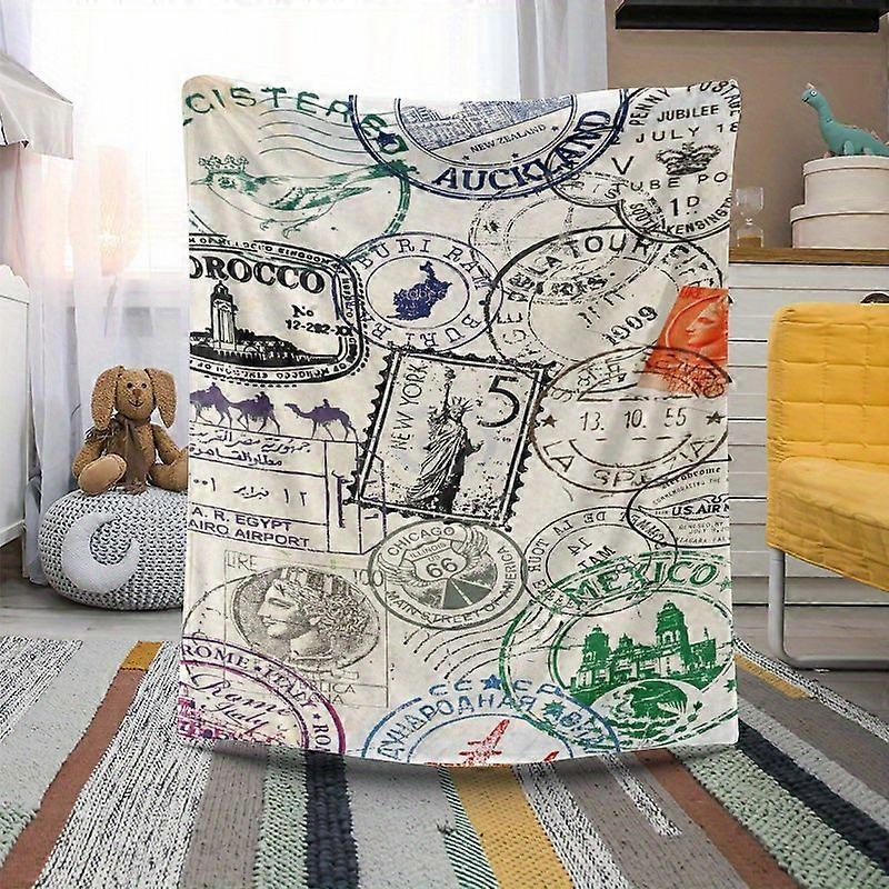 Vibrant Travel-Themed Flannel Blanket with Colorful Stamps & Passport Seals - Ultra-Soft Digital Print, All-Season Cozy -asdfg269