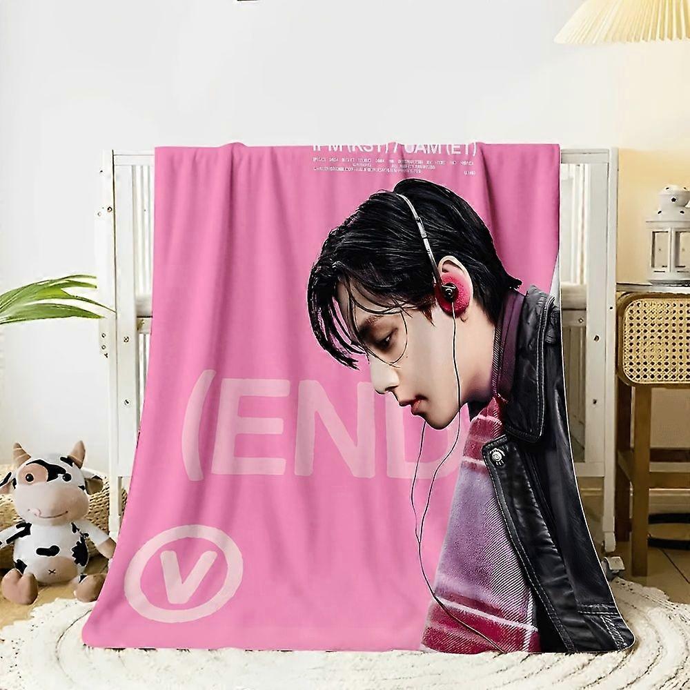 1pc Kim Tae-hyung them Flannel Blanket - Soft Pink Cartoon Design with Red Headphones & Black Jacket, Machine Washable, -qazxc322