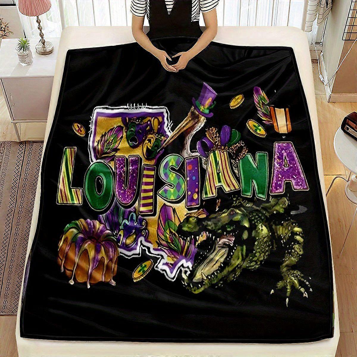 Louisiana-Themed Polyester Blanket with Alligator & Mardi Gras Design - Soft, Colorful, Versatile Indoor/Outdoor Throw B-poiuy404