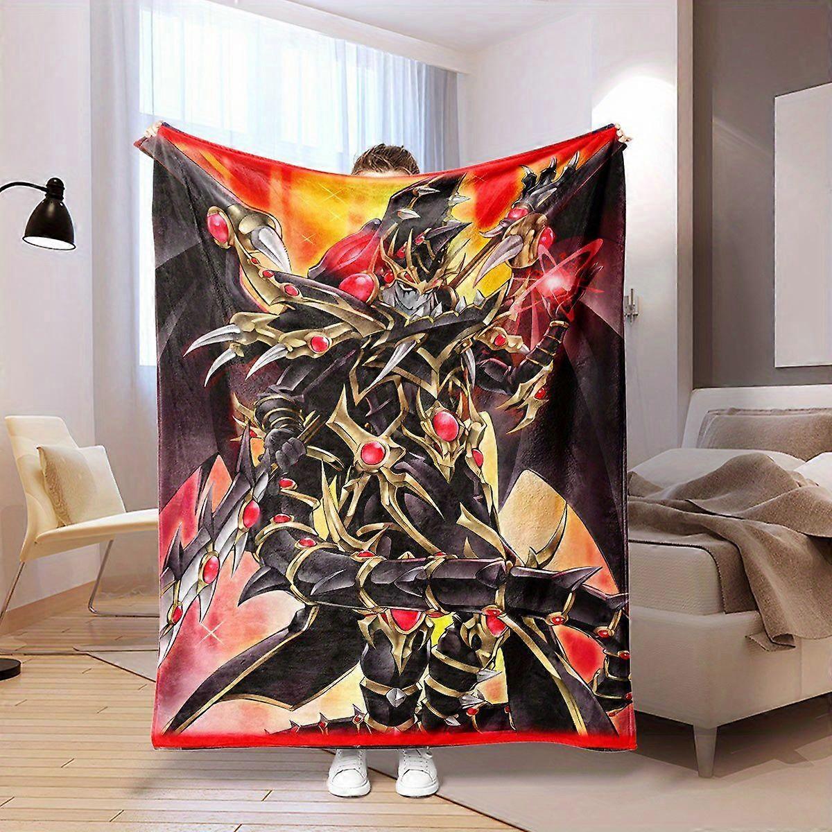 Dragon Fighter Anime-Themed Polyester Knit Blanket - Vibrant Red & Black Design with Golden Armor & Weapons, Soft & Comf-POKJH17