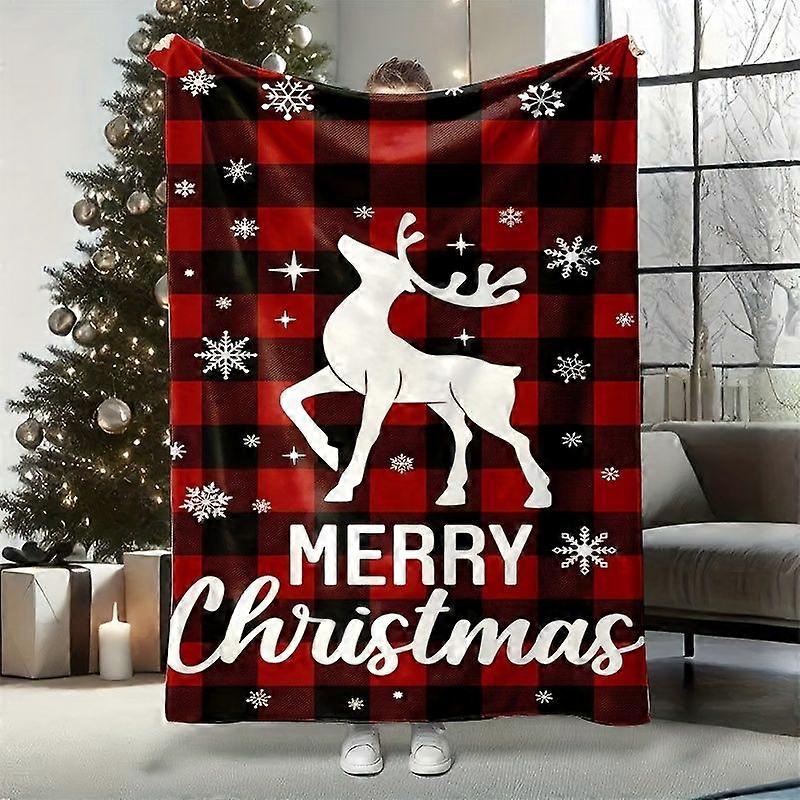 1pc Christmas Reindeer & Snowflake Plaid Flannel Blanket - Red & Black Checkered with Reindeer & Snowflakes, Durable Mac-POKJH57