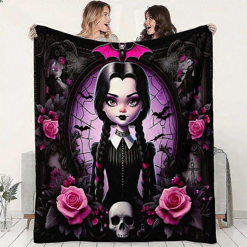 1pc Dark Wednesday (Wednesday Addams) Themed Blanket - Gothic Flannel Bedspread with Chibi-Style Addams Family Character-POKJH69