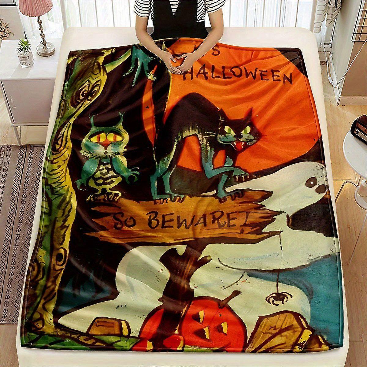 1pc Halloween Throw Blanket - Black Cats, Pumpkins, Ghosts Print - Soft Flannel-like Polyester All-Season Decorative Bla-POKJH289