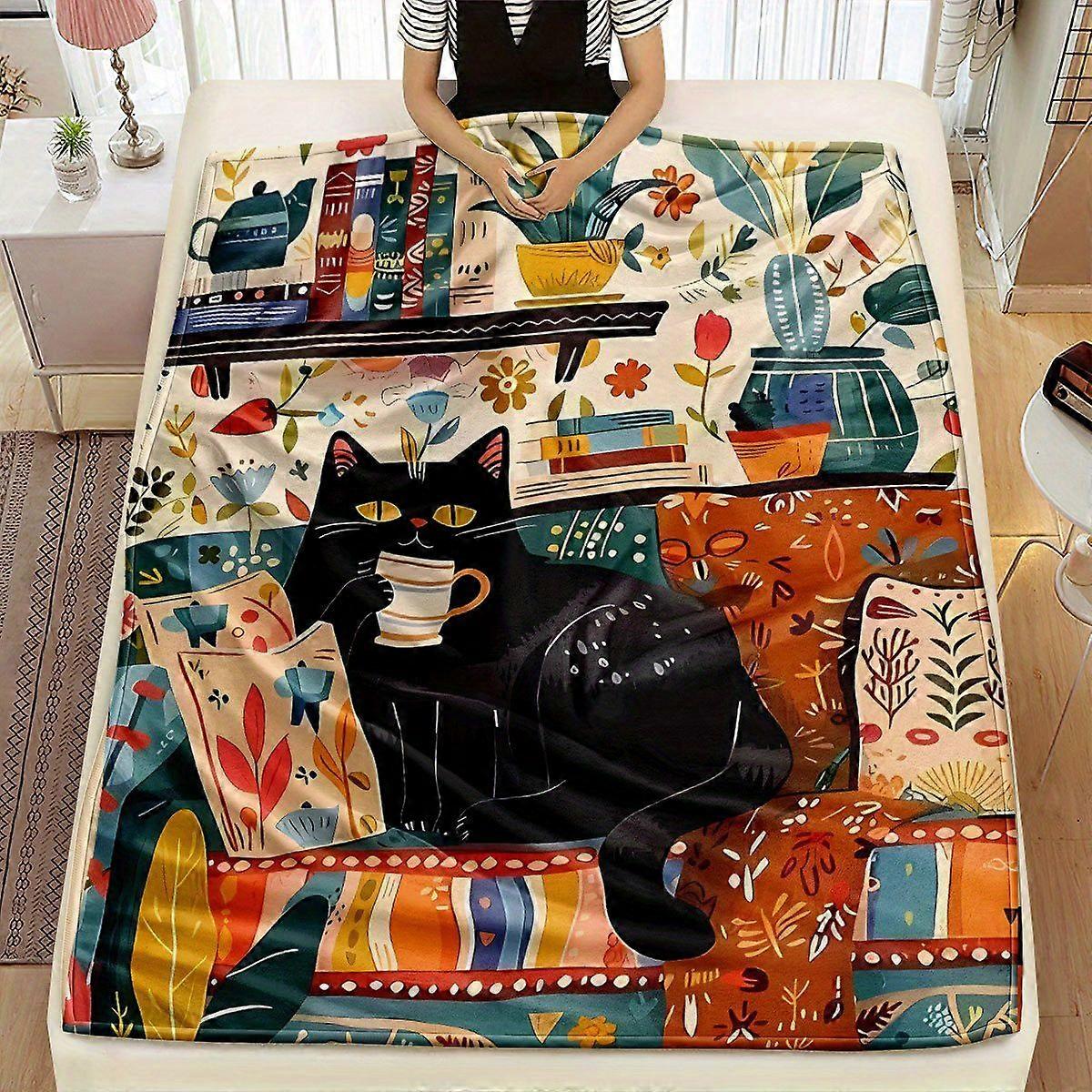 Cozy Black Cat Print Flannel Throw Blanket \u2013 Soft, Versatile, and for Home or Office Decor, Perfect for All Seasons-POKJH278