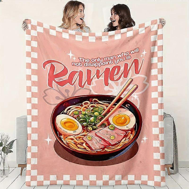 1pc Ramen Noodle Blanket - Soft Flannel All-Season Bedspread with Ramen Bowl & Chopsticks Print, Pink Text Design for Ho-POKJH179