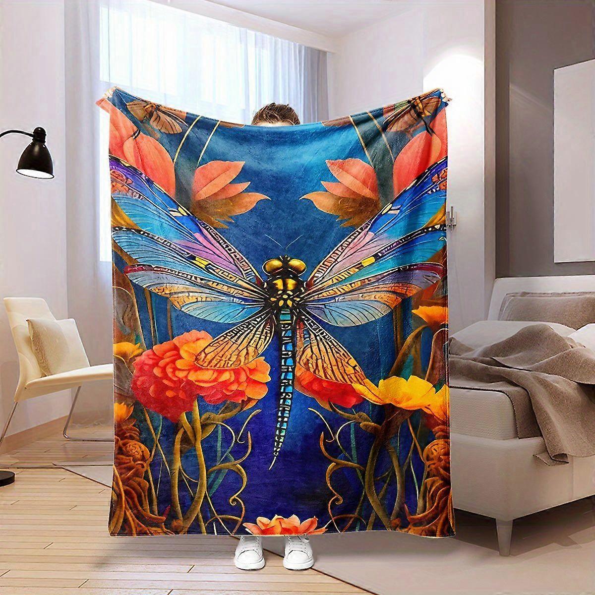 Dragonfly Print Flannel Blanket - Vibrant Floral & Dragonfly Design, Soft All-Season Multi-Use Throw for Home Decor, Tra-POKJH319