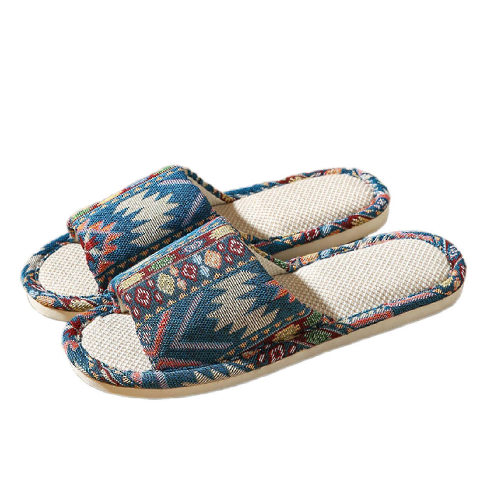 Ethnic Styles Women's Men's Home Slippers Moisture Wicking Cotton Linen Fabric Slip Prevention Design Sandals Shoe Blue E.