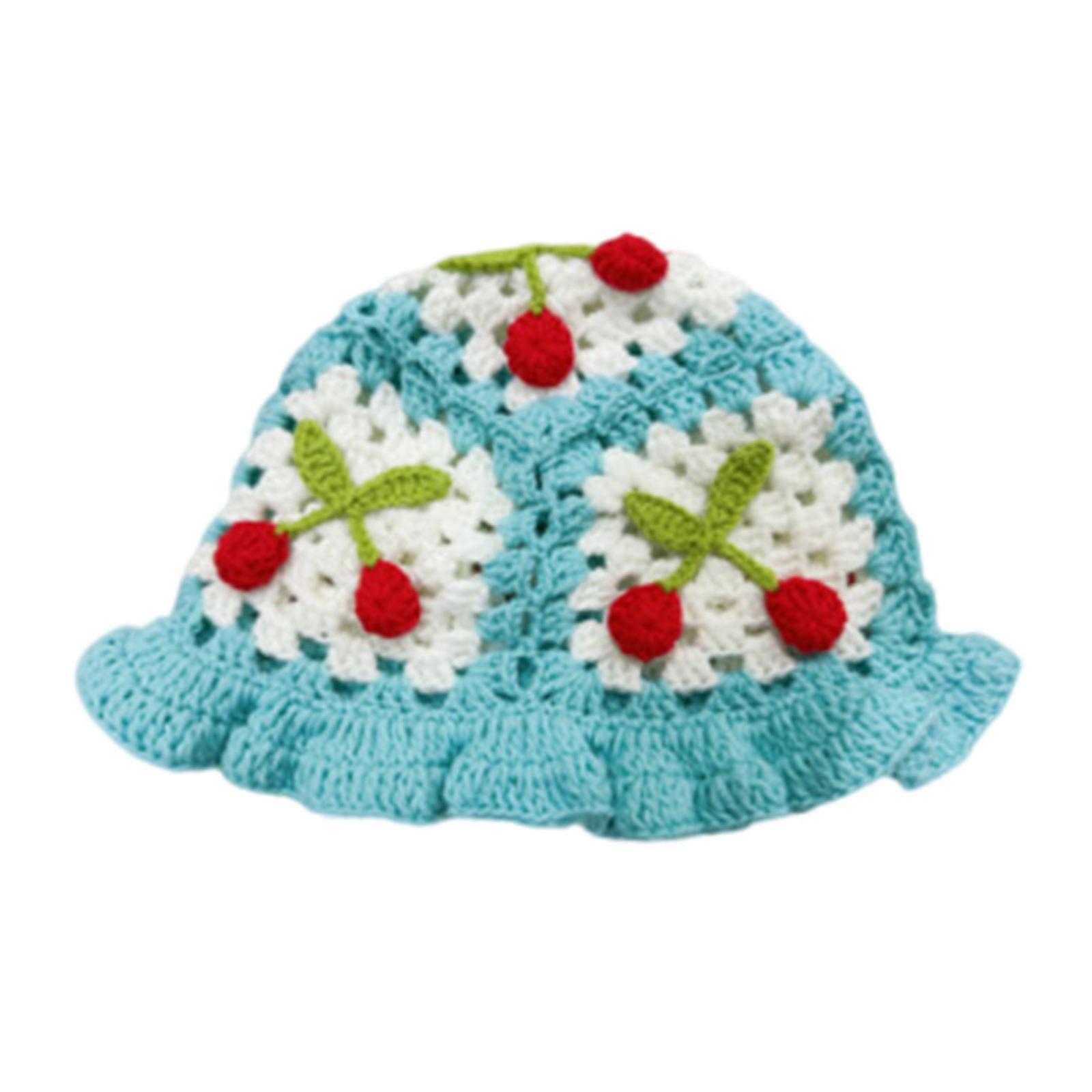 Stylish Acrylic Knitted Hat Cherry Detailing Unisex Design Foldable For Travel Compact Storage Sky Blue M
