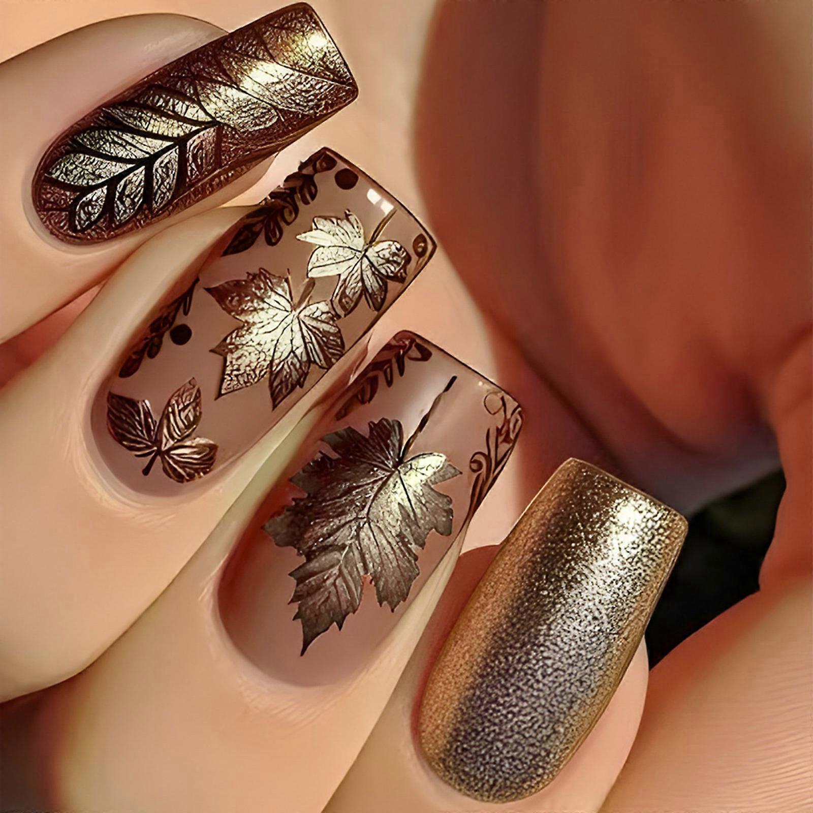 24 Pieces Medium Square False Nail Designed With Golden Glittering Leaves Press on Nail For Autumn And Winter Wear Multicolor