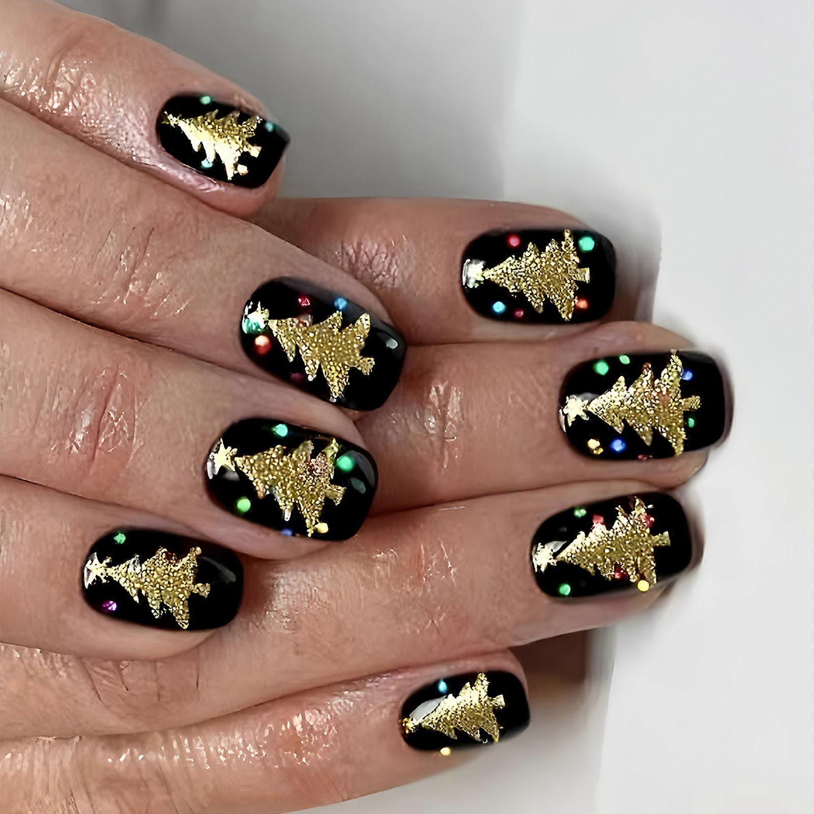 24Pieces Gold Foil Glittering Press on Nail Tips Christmas Short Look Manicure Art Artificial Fingernails Set Multicolor