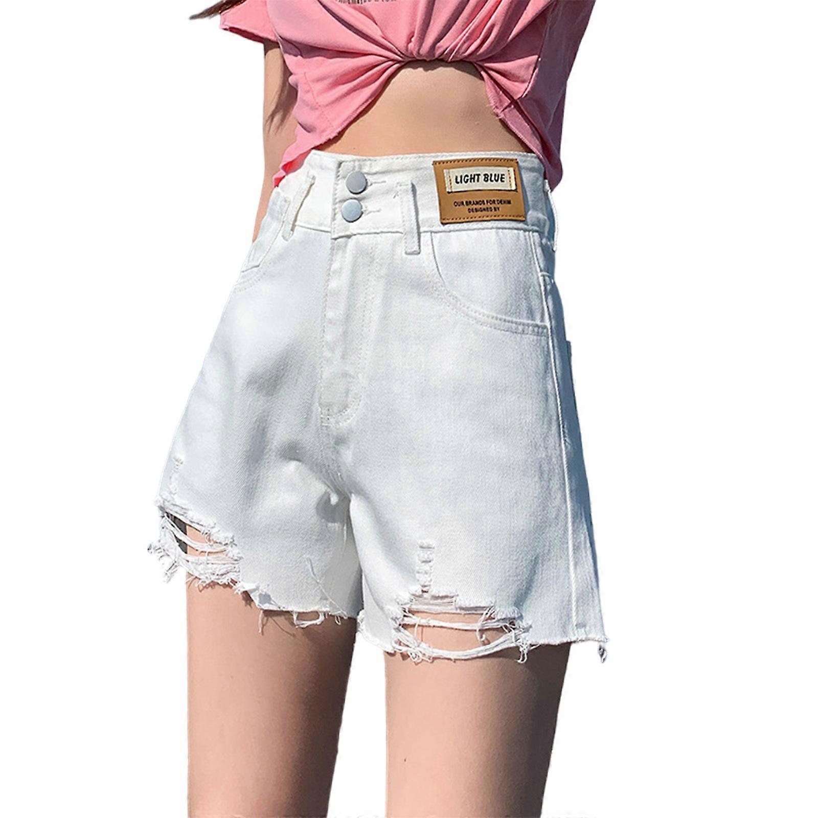 Women Summer Casual High Waist Denim Shorts Double Buttons Letters Label Ripped Hole Jeans Vintage Distressed Frayed Hem Wide Leg Short Pants White