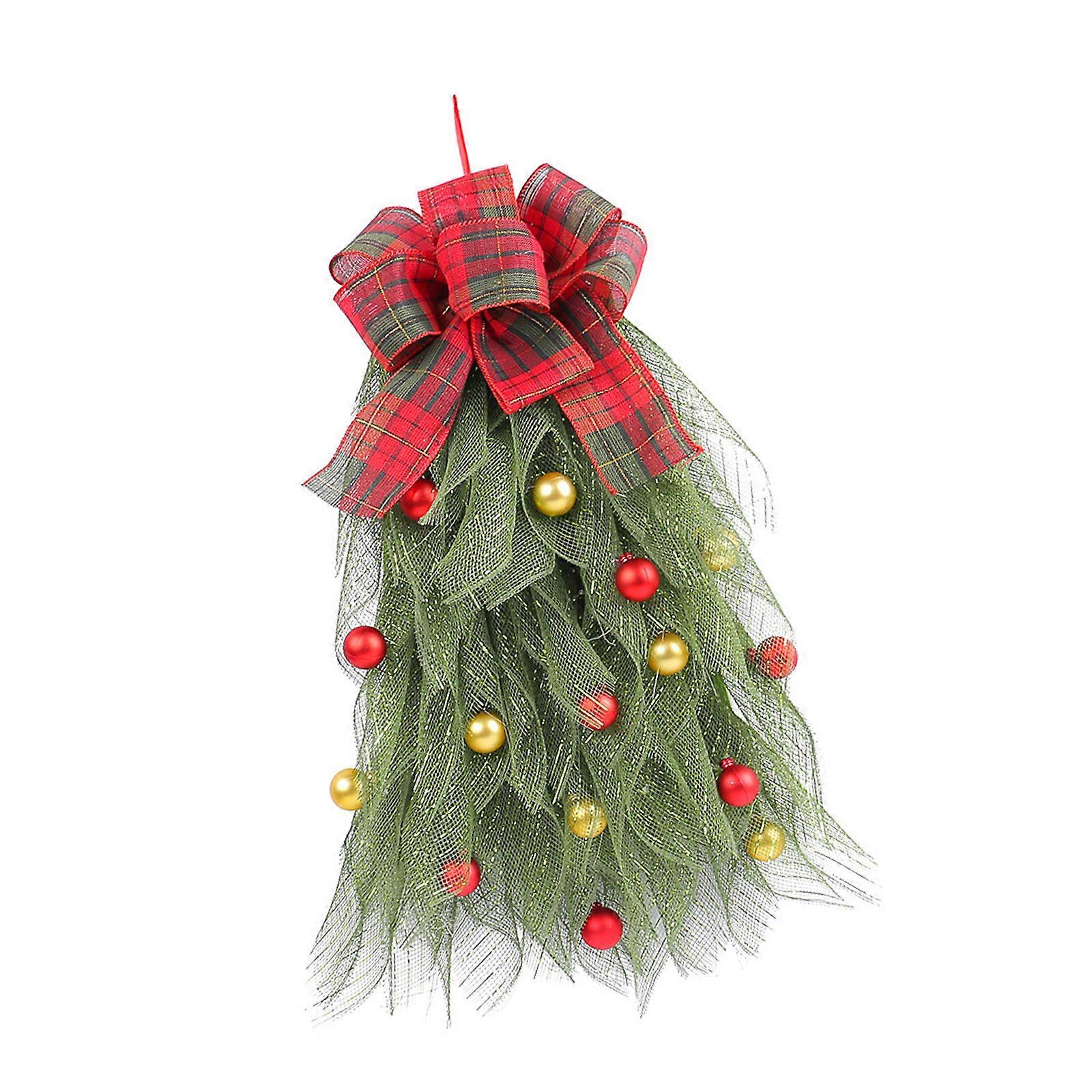 Festival Christmas Tree Wreath with Plaids Bowknot and Balls Ornament for Holiday Party Front Door Wall Hanging Decors Multicolor
