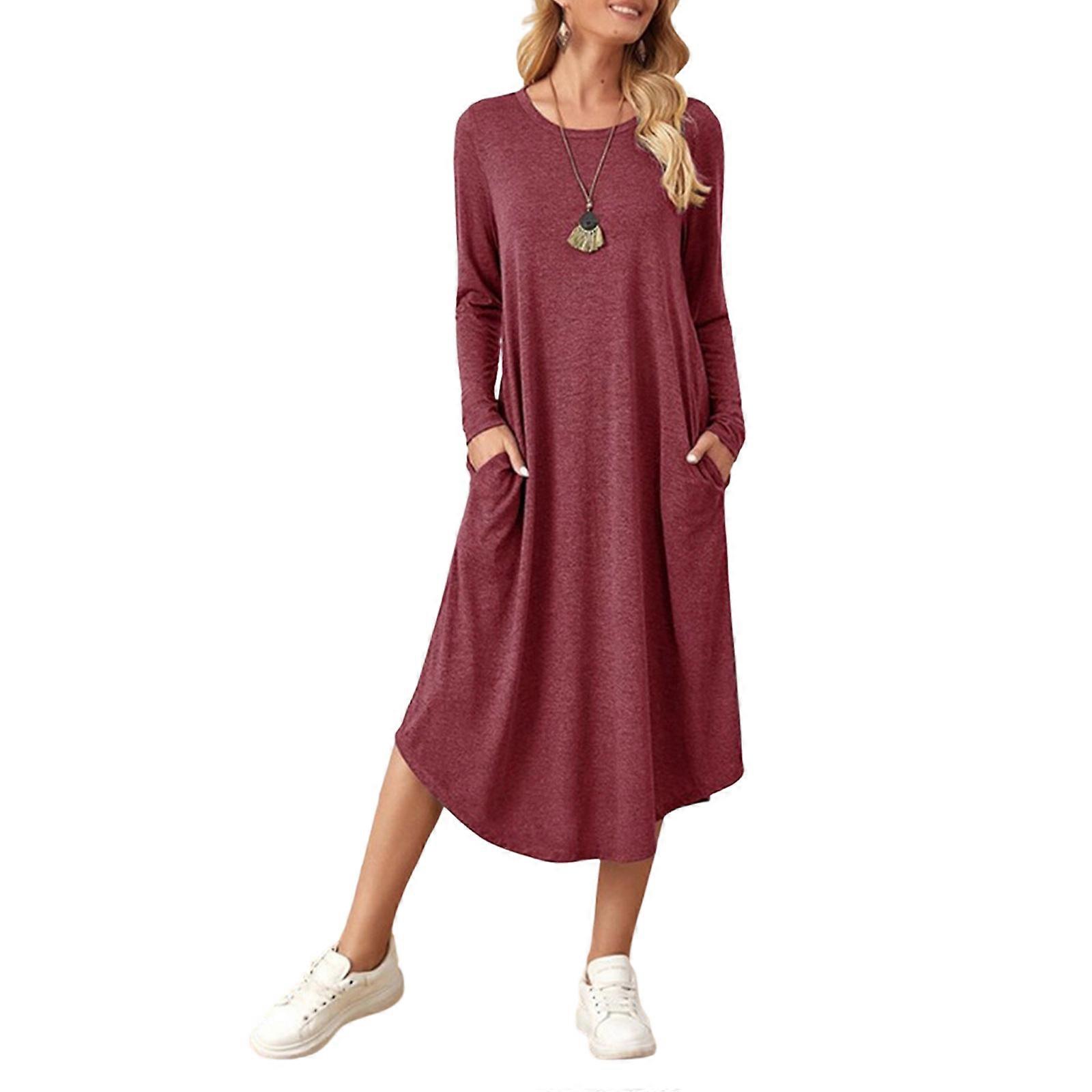 Women's Casual T-shirt Style Long-Sleeved Dress with Pockets for Autumn rouge color XL