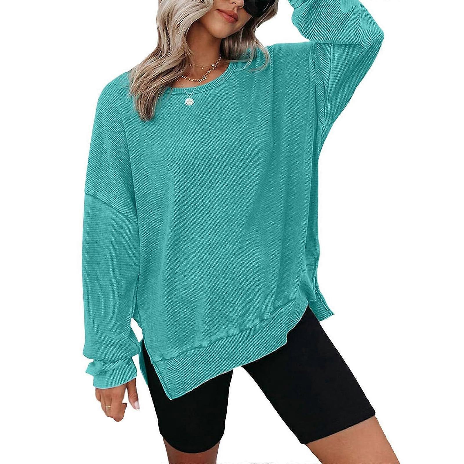 Sweatshirt for Women Oversized Waffles Knit Crewneck Sweatshirts Long Sleeve Side Slits Casual Pullover Tops Sky Blue XL