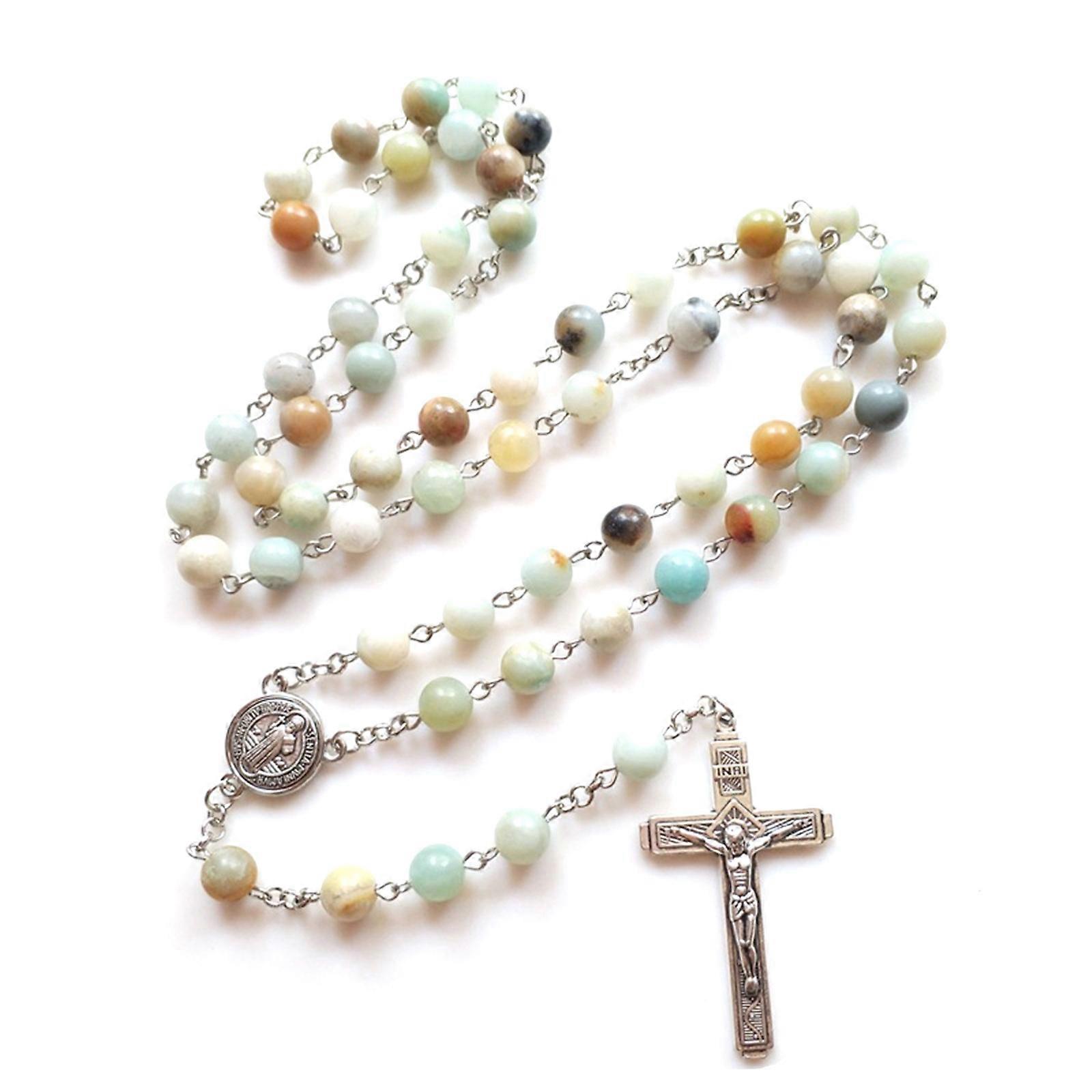 Vintage Catholic Rosary Necklace Vintage Natural Beads Crucifix Pendant Cross Necklace Christian Religious Women Jewelry Multicolor