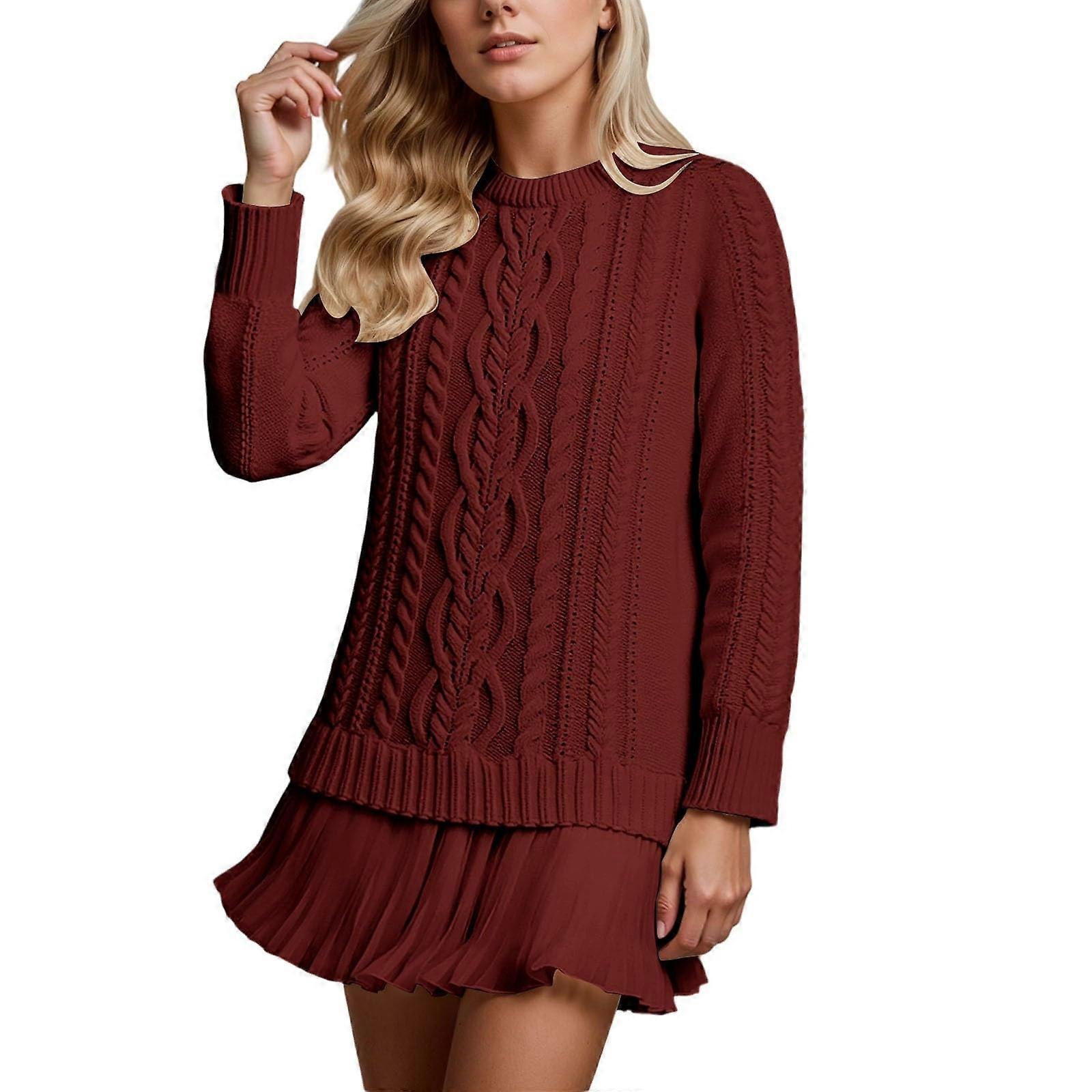 Cable Knit Short Sweater Dress for Women Long Sleeve Crew Neck Pleated Chiffon Splicing A Line Ruffle Flare Jumper Dress Burgundy XL
