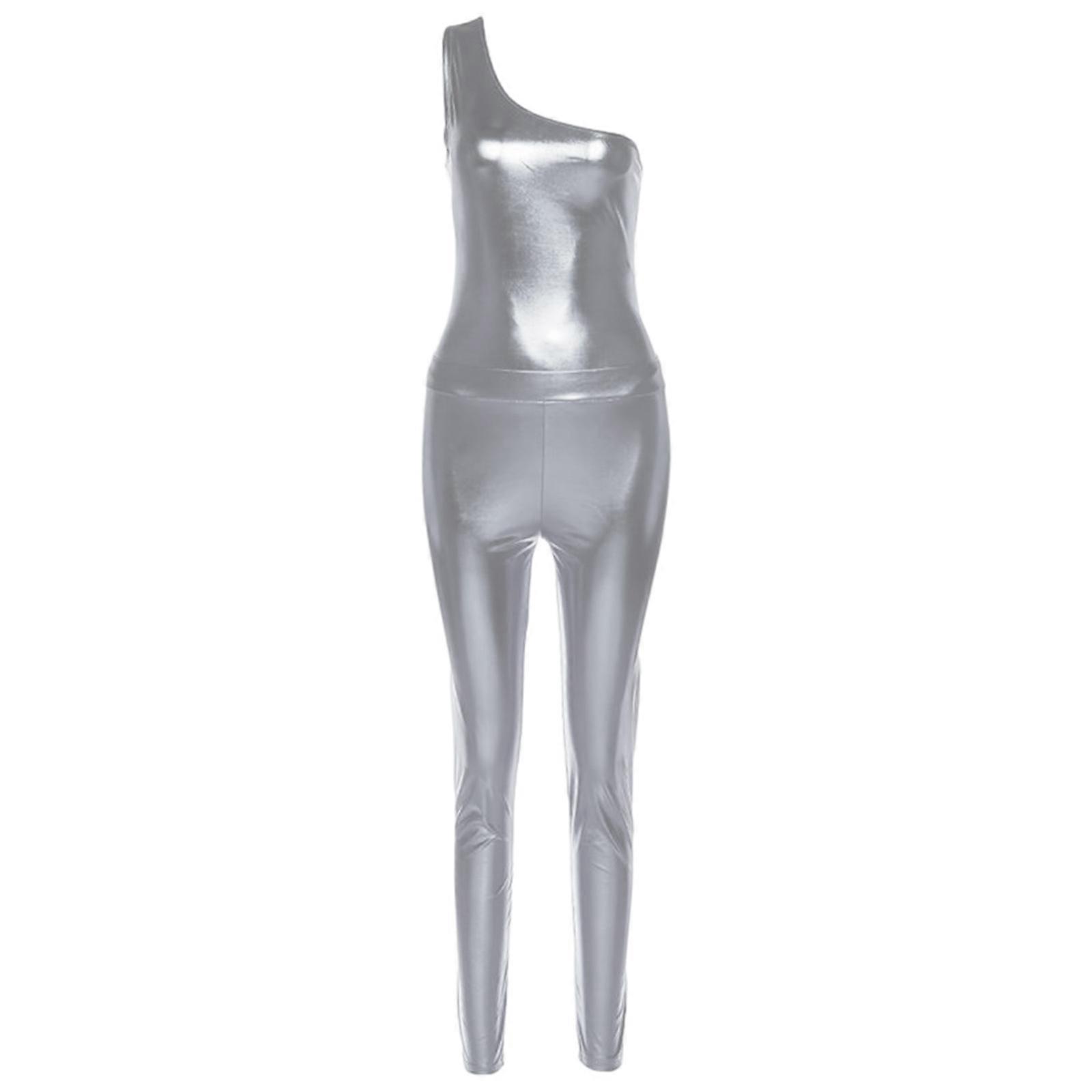 Womens Streetwear Sets Outfits Sportswear Two Piece High Waist Skinny Trousers Single Shoulder Top And Tights Pants Set Silver S