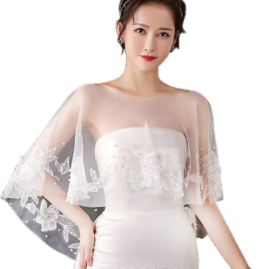 Womens Floral Lace Embroidered Shrug Shawl Wrap Wedding Bridal Bolero Tulle for Jacket Imitation Pearl Beaded Cover Up C Multicolor